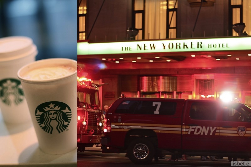 Totuus: meille ei käynyt ihan yhtä auvoisesti! Hotelli huolehti herätyksestä klo 04.45, kun palohälytys pärähti käyntiin. Koko 40-kerroksisen rakennuksen väki marssitettiin kapeassa porraskuilussa alas kahdeksannelle avenuelle ihmettelemään paloautojen saapumista. Kyseessä ei ollut väärä hälytys, sillä savun katku tuntui selvästi toisessa porraskuilussa, jota ei voinut käyttää. Myöhemmin selvisi, että palo oli ollut kaksi kerrosta alapuolellamme 20. kerroksessa mutta sen tarkempaa informaatiota henkilökunta ei suostunut antamaan. (Uutisista saattoi kuitenkin lukea, että kyseessä oli norjalaisen turistin tekonen.)