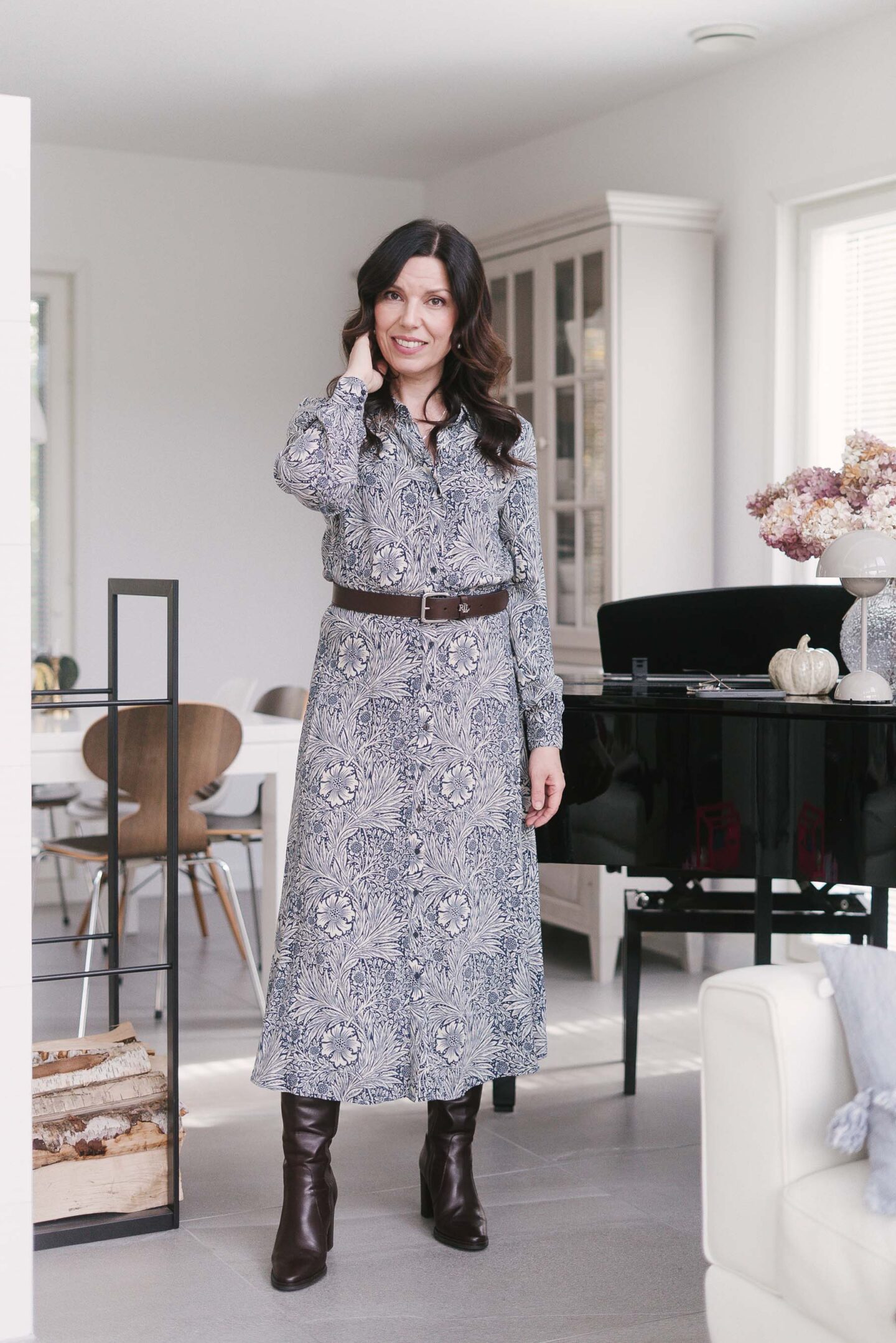 Hyvä lokakuista torstaita sinne! Pyöräytetään päivä käyntiin näillä asukuvilla, joissa komeilee second handina ostettu H&M:n ja Morris&Co:n vuoden 2014 yhteistyömalliston mekko. Olen pitänyt niin paljon siitä aiemmasta mekosta, joka minulla on tästä mallistosta, että päätin hankkia myös tämän Marigold-kuosisen paitamekon. H&M oli kyllä aikaansa edellä malliston lanseeratessaan, sillä William Morris -buumi näyttää saavuttaneen huippunsa vasta aivan viime vuosina. Kaiketi nämä kuviot edustavat kaikkea sitä, mitä näinä kuohuvina aikoina kaipaamme: kodikkuutta, pysyvyyttä ja paluuta ”vanhaan hyvään”. Eikä sekään tietysti haittaa, että kuosien tekijänoikeus raukesi jo ajat sitten ja ne ovat ilmaisia kenen tahansa tuotteissaan käyttää.