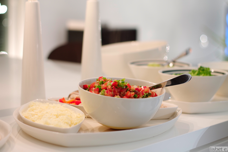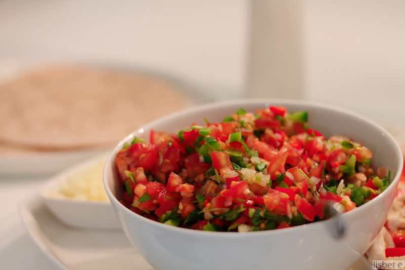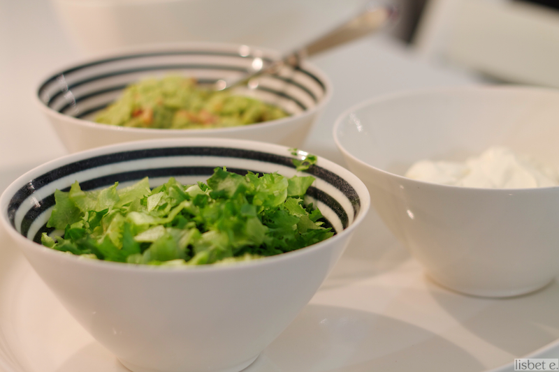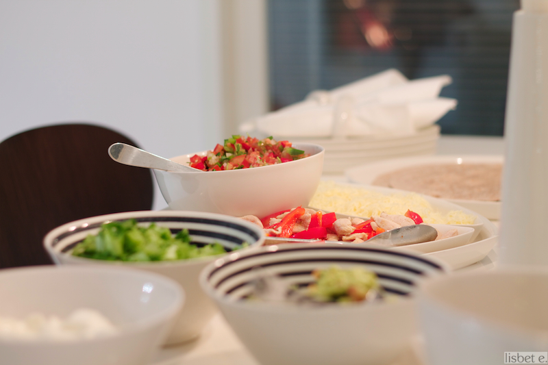 Tarjottavaakaan en ollut miettinyt etukäteen, mutta matkalla töistä kotiin ehdin juuri ja juuri hakemaan ainekset tortilloiden täytteeksi. Herkuttelimme siis tuoresalsalla, guacamolella, ranskankermalla ja kanapaistoksella.