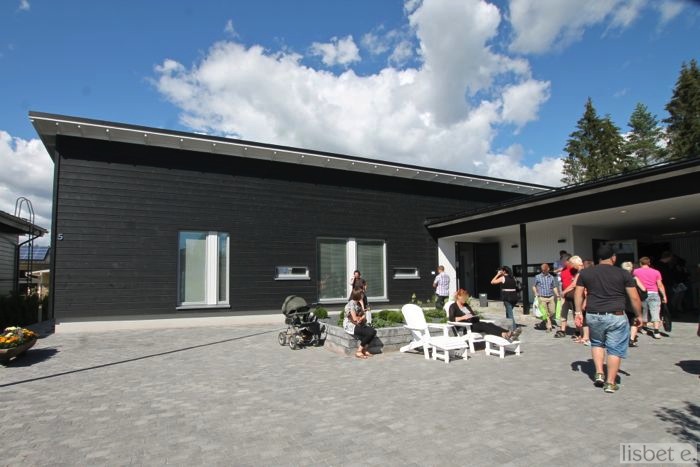 Messupostausten päätteeksi vielä kuvia itse messualueelta ja talojen julkisivuista. Vuoreksessa ei juuri perinnetaloja nähty, vaan ilme oli pääasiassa graafinen ja pelkistetty. Värimaailma puolestaan oli lähinnä mustaa ja valkoista, jonka joukossa oli jonkin verran kellertäviä ja tiilenpunaisia sävyä. Musta puupinta, valkoinen rappaus ja näiden molempien yhdistelmä olivat suosittuja. Mustaa tai hiilenharmaata rappausta oli myös käytetty useammassa kohteessa.