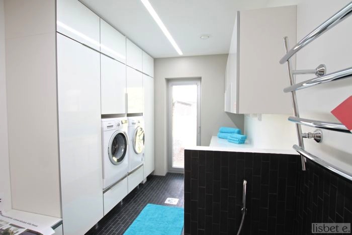Kosteissa tiloissa ei ole kikkailtu laattavalinnoilla ja valaistus on toteutettu kattoon upotettuna juovana. Itsekin valitsisin kylpyhuoneen pintamateriaaleiksi mahdollisimman eleettömät ratkaisut. Miksi ylipäätään kodin jokaisessa kosteassa tilassa pitäisi olla eri laatat, eikö yhtä hyvää voi käyttää joka paikassa? Kodinhoitohuoneesta aukeaa muuten suora linja walk-through-closetiin, päämakuuhuoneeseen ja talon toisessa päädyssä sijaitsevaan kylppäriin. Minun ei varmastikaan tarvitse kertoa teille, miten mahtava tuollainen vaatehuone olisi – hieman miinusta tulee kuitenkin puutteellisesta valaistuksesta,