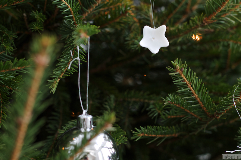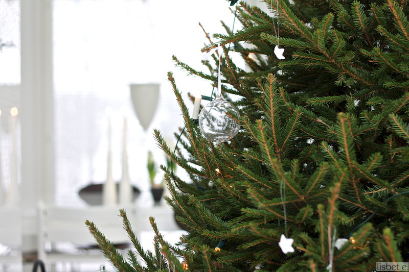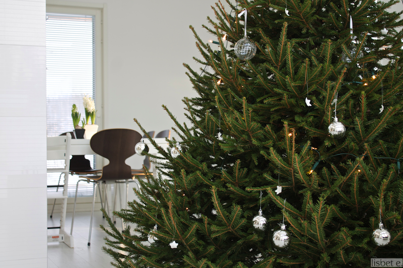 Koristelussa on suosittu tarkoituksella yksinkertaista linjaa. Pari vuotta sitten kävin läpi bling bling -vaiheen kuusenkoristeissa, mutta nyt jätin glitteriperhoset ja hilepallot suosiolla pahvirasiaansa. Kuusessa on valosarjojen lisäksi hopeapalloja, Iittalan Sarjaton-lasipalloja sekä pieniä keraamisia tähtiä, jotka anoppi toi pikkujoululahjaksi Ornamon joulumyyjäisistä. En valitettavasti tiedä niiden valmistajaa.