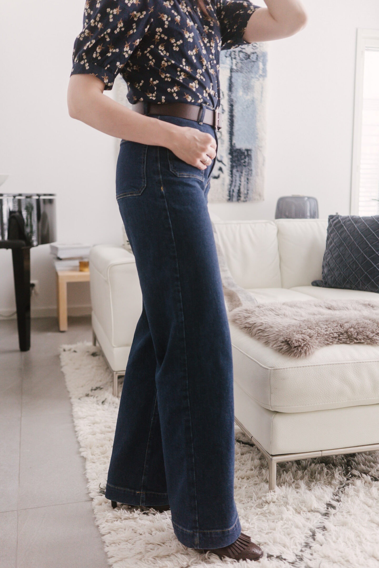 Paula-farkkujen yksi parhaista puolista on se, että mallia on saatavissa eri pituisina. Pillifarkkujen pitkään jatkuneena valtakautena ehti jo unohtaa, miten tärkeää on lahkeen oikea mitta. Nilkkamittaisten pillifarkkujen kanssa saattoi käyttää yhtä hyvin tennareita, korkokenkiä kuin ballerinojakin. Leveässä lahkeessa pituudella on merkitystä riippuen siitä, millaisten jalkineiden kanssa farkkuja käyttää. Kun pidän farkkuja korkokenkien kanssa töissä tai vapaalla korkeakorkoisten saappikkaiden kanssa, haluan, että lahje on riittävän pitkä laskeutuakseen kevyesti kengän päälle. En ole vajaamittaisen lepattavan lahkeen ystävä enkä varsinkaan yhdistäisi sellaista korkkareihin, vaikka kaiketi sekin on nykyään muotia.