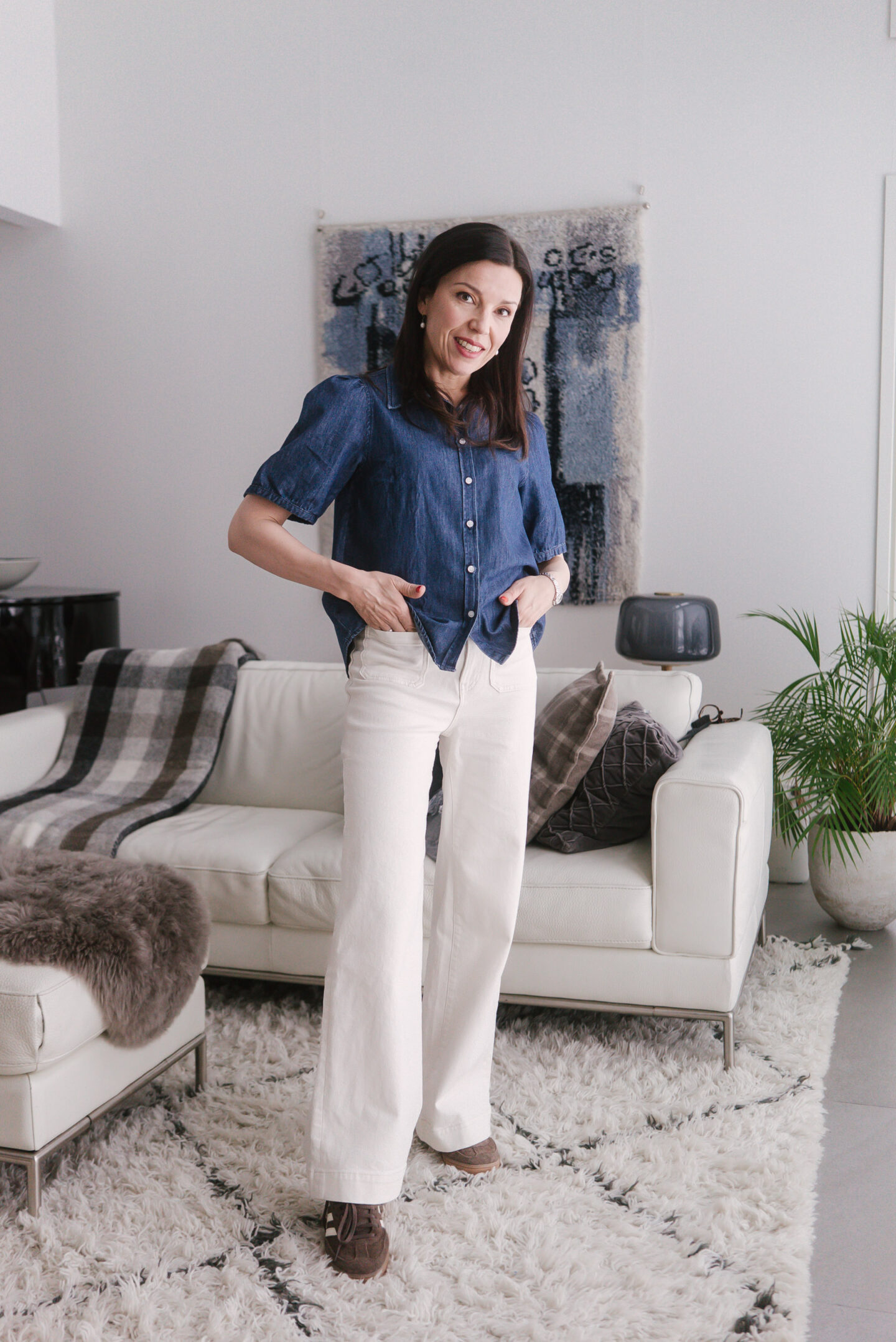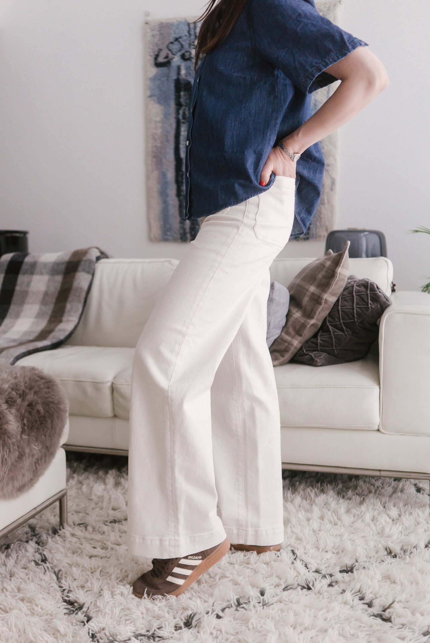 Silloin kun jalassa puolestaan on matalat kengät, lahkeen ei halua laahaavan maata, likaantuvan ja rispaantuvan. Ei varsinkaan näiden luunvalkoisten farkkujen, jotka ostin lyhyellä lahkeella tulevia kevätpäiviä ja tennarikelejä ajatellen. Sininen farkkupaita on myös Lindexin tämän kevään Holly & Whyte -valikoimasta.