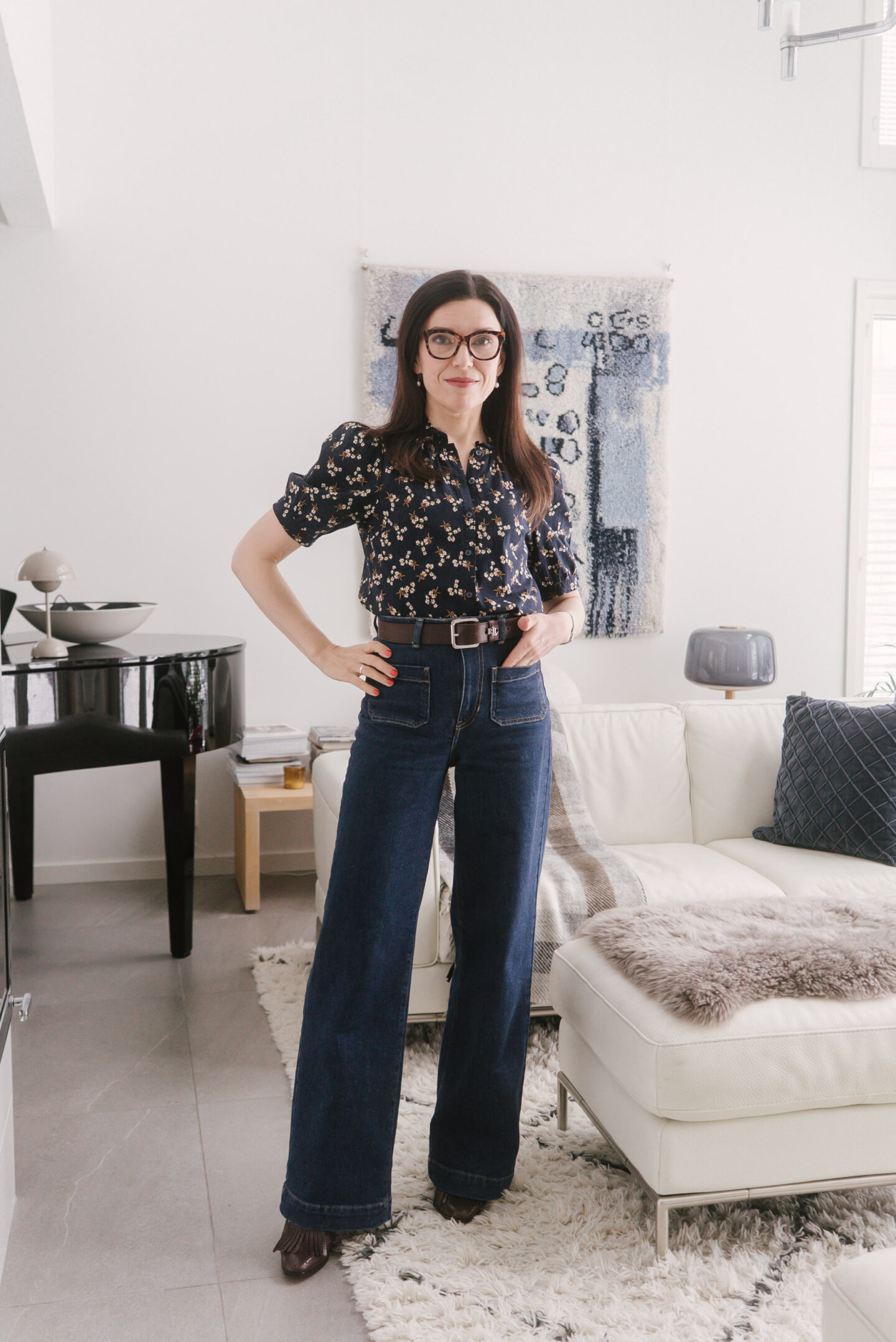 Lauantaita! Tänään jaan muutaman kuvan viime päivien työasuista. Yleensä minulla ei ole juuri ollut farkkuja esiintymisvaatteena, mutta ostin hiljattain parit kivat farkut, joita on tullut käytettyä aamuvuoroissa. Molemmat ovat Lindexin Paula-mallia, joissa on korkea vyötärö ja suorat leveät lahkeet. Leveälahkeinen farkkumuoti on aiemmin tuntunut vähän vieraalta ja monet mallit itselleni ylisuurilta, mutta näissä on kivan napakka istuvuus vyötäröltä lantiolle, josta lahje kauniisti laskeutuu. Nämä tummansiniset farkut ilman kulutuspesua sopivat hyvin toimistopukeutumiseenkin vaikkapa bleiseriin tai paitapuseroon yhdistettynä.
