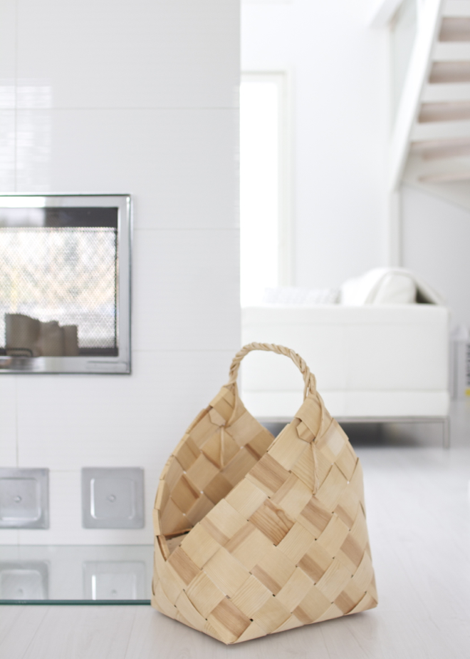 Ihanaa, kohta saa taas polttaa tulta takassa! Onko mitään kotoisampaa kuin hiippailla yön jäljiltä hieman viileään alakertaan ja sytyttää takkaan hiljaa räsähtelevä tuli? Takkaa poltettiin viime talvena ahkerasti jo pelkästään lämmitystarkoituksissa, sillä talo on muuten sähkölämmitteinen. Lämmityskautta ajatellen ostin takkapuille tuollaisen vinopärekorin, joka tuo rosoista kodikkuutta olohuoneen moderneihin linjoihin. Korissa puista irtoavat roskat pysyvät myös vähän paremmin sisällä kuin avonaisissa puunkantimissa.