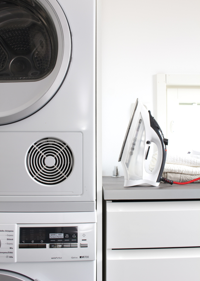 Nyt kurkataankin paikkaan, joka ei ole aiemmin blogissa näkynyt, eli kodinhoitohuoneeseen. Tämä on yksi omakotiasumisen parhaita puolia: vaatehuollolle ja muille kodin askareille on varattu oma tila. Tosin meilläkin kodinhoitohuone näyttelee kaksoisroolia saunan pukuhuoneena. Ovesta on suora käynti takapihan paljulle, jota emme ole vielä kertaakaan saaneet aikaiseksi lämmittää.