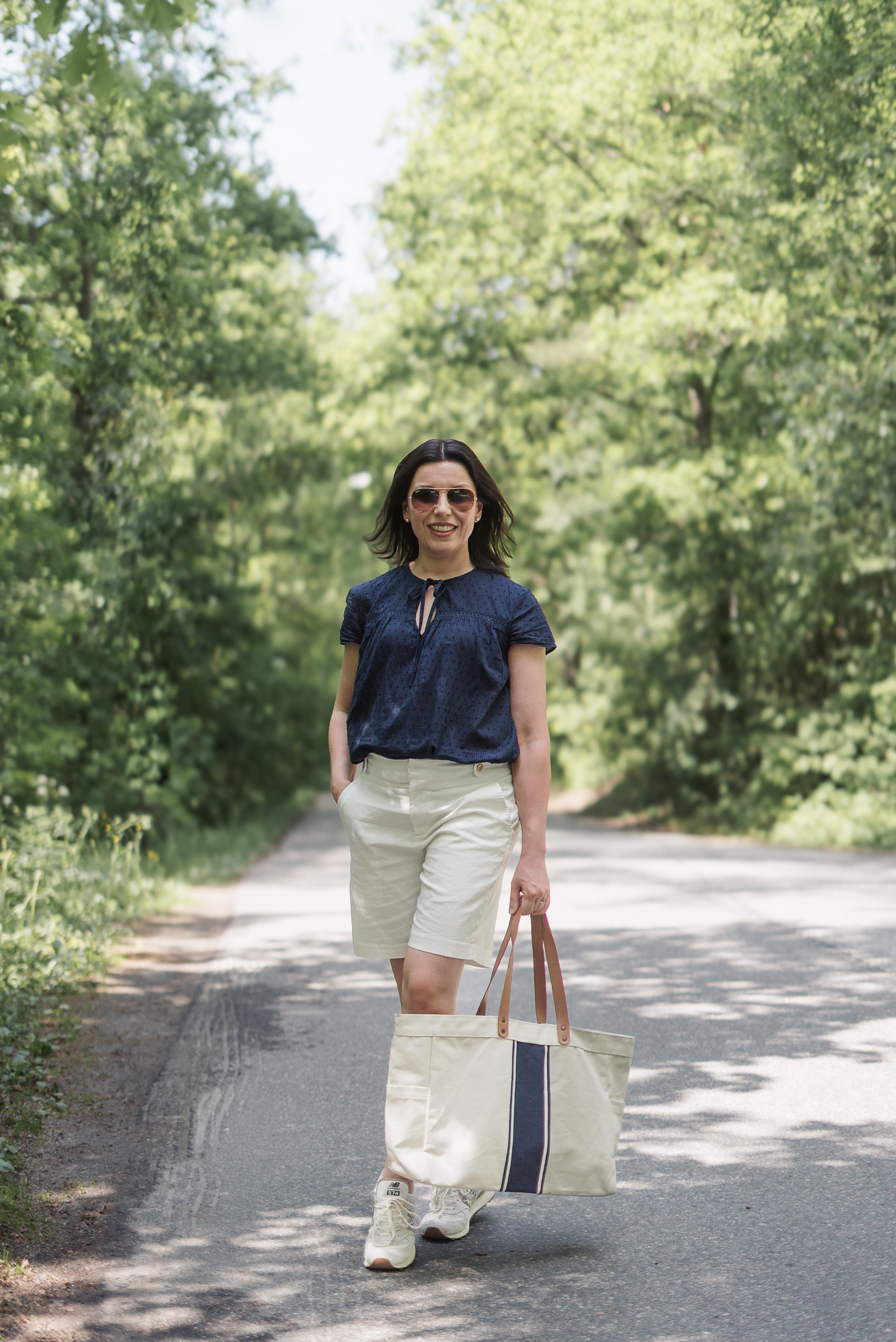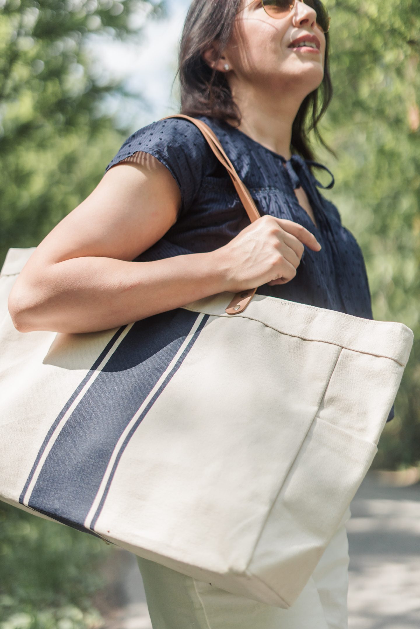 Toisaalta tuntuu, että lomalla ollaan oltu jo hyvinkin kaksi viikkoa, sillä helluntain jälkeen koulun ohjelma on ollut sangen leppoisaa ja päivät lyhyitä. Pitkinä iltapäivinä on ehditty tehdä jo monta reissua uimarannalle. Pojat pakkaavat uimavarusteet aina ”sipsikassiin” eli sellaiseen jättikokoiseen sipsipussin näköiseen säkkiin, jonka esikoinen onnistui muutama vuosi sitten pyydystämään Linnanmäen onnenpyörästä (täynnä oikeita sipsipusseja tietysti). Itse olen kaivannut uimarannalle ja muihinkin kesärientoihin hieman fiinimpää mutta kuitenkin rentoa ja riittävän tilavaa laukkua. Kirjoitin Googleen ”canvas tote”. Mielessä oli ehkä jokin malli Lexingtonilta, Tommy Hilfigeriltä tai J. Crew’ltä, mutta Googlen onnenpyörä ohjasikin minut kotimaisen Piirongin sivuille, jossa tämä raikasraitainen kassi odotteli minua alle 40 euron hintaan.