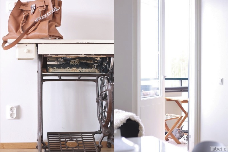 Ei sisustusmakuni oikeastikaan ole mitenkään ylenpalttisen rönsyilevä, mutta voisi täällä jotain pientä tehdä kesää kohti. Matoilla ja tekstiileillä saisi luotua kodikasta tunnelmaa. Alakuvan ompelupöydän maalipinnalle pitäisi näyttää hiomalaikkaa ja sijoittaa pöytä järkevämpään paikkaan, ehkä makuuhuoneeseen. Tuossa keittiön kyljessä se vain kerää rojua päälleen.