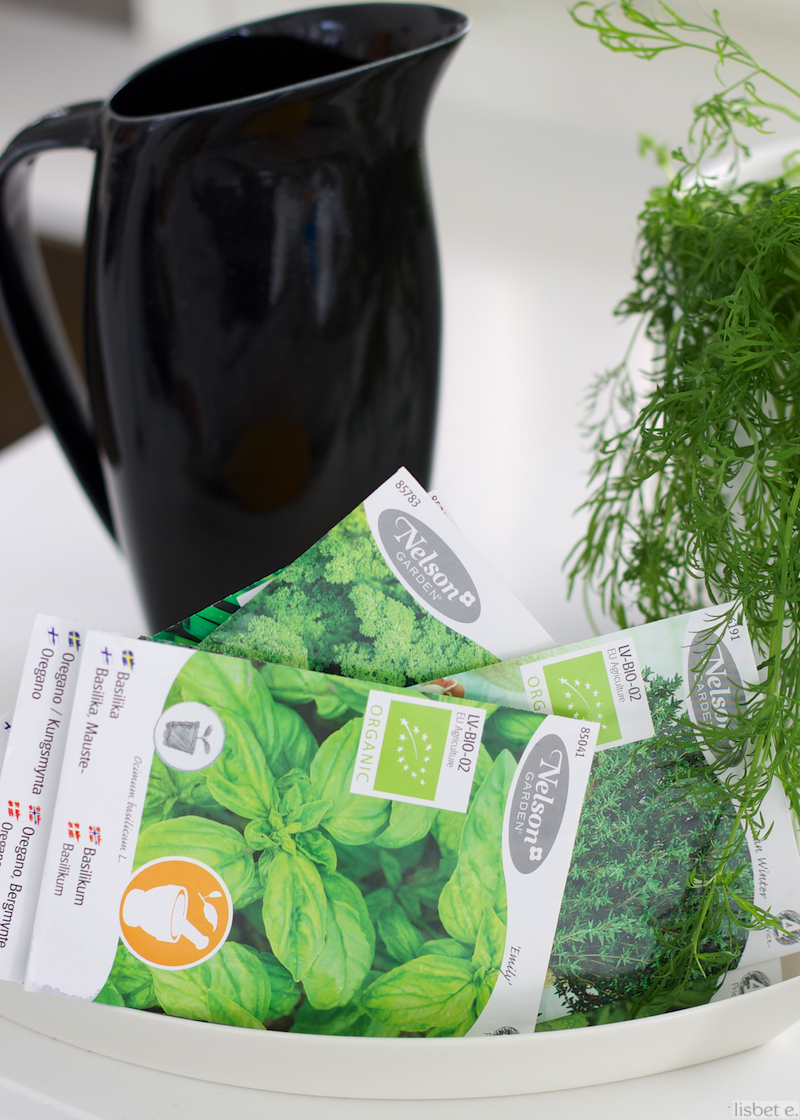 Sitten seuraa postauksen tunnustusosuus: alunperin minun piti kasvattaa yrttitarhani tietysti idättämällä kasvit siemenestä alkaen itse. Noukin kaupan hyllystä vihreitä suosikkejani ja vasta kotona vaivauduin lukemaan pussien selosteet – mitä, satoa pitää odottaa kesä-heinäkuulle asti? Aion kyllä laittaa nämäkin itämään. Osa ehkä ehtii antaa satoa sisällä, osan voin istuttaa ilmojen lämmettyä pihalle ruukkuun.