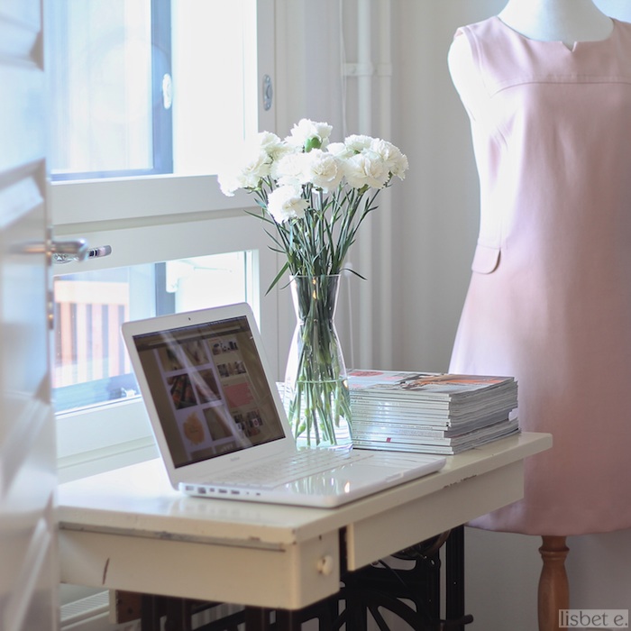 Blogin kirjoittaminen on oman tilan ottamista. Arki saattaa olla niin aikataulutettua, että ajan käyttäminen näiden tekstien kirjoittamiseen ja valokuvien ottamiseen on mitä suurinta itsekkyyttä. Luulen, että tämä itsekkyys pitää minut järjissäni. Tänään valtasin itselleni tilaa vähän konkreettisemminkin, kun kannoin ompelupöydän makuuhuoneen nurkkaukseen ja julistin kyseiset kolme neliötä omakseni. Valon puolesta tuossa olisi hyvä paikka myös meikkaamiseen, jos vain keksin jonkin käytännöllisen tavan säilyttää kosmetiikkaa käden ulottuvilla. Ompelupöydässä ei valitettavasti ole kuin yksi pieni laatikko.