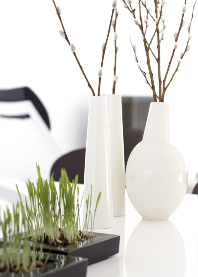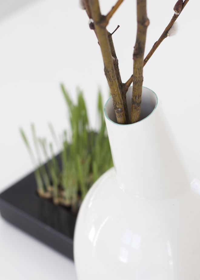 Stressittömiin pääsiäispuuhiin kuuluu ruohon laittaminen itämään – tai tässä tapauksessa ohran. Pajunkissat tarttuivat mukaan ulkoilureissulta.