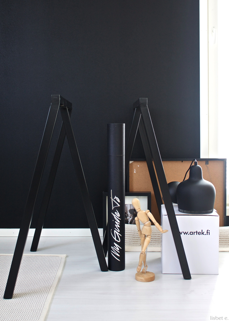 Työhuoneeseen tarkoitetut Hayn Loop-pukkijalat saapuivat viime viikolla – Finnish Design Shop toimitti ne moitteettomasti ja kommelluksitta. Pöytälevyksi ajattelimme vaaleaa puutasoa. Bauhausissa katseltiin jo sopivia, mutta se, miten levy mahdollisesti käsitellään, jäi vielä auki. Huoneen mustalle seinälle tuleva taulu- ja julistekollaasi alkaa myös vähitellen hahmottua…