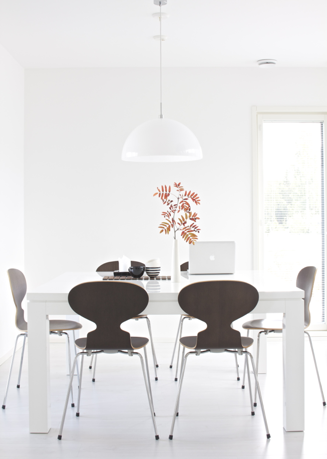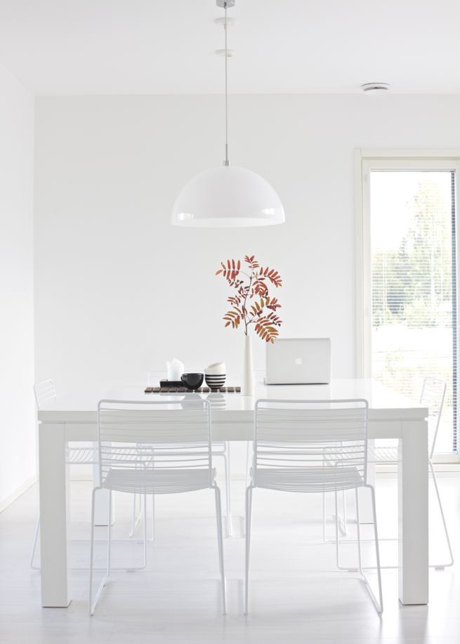 Ta-daa: Hayt sisätiloissa Valantin Ruutu-ruokapöydän kanssa! Tulipa valkoista ja jotenkin… ilmavaa. Yhdistelmä ei ole aivan täysosuma, mutta jonkin keveämpirunkoisen pöydän kanssa Hayt menisivät mainiosti. Meillä nämä tuolit päätynevät pinottuna talvisäilöön yläkerran yhä tyhjyyttään kumisevaan aulaan.
