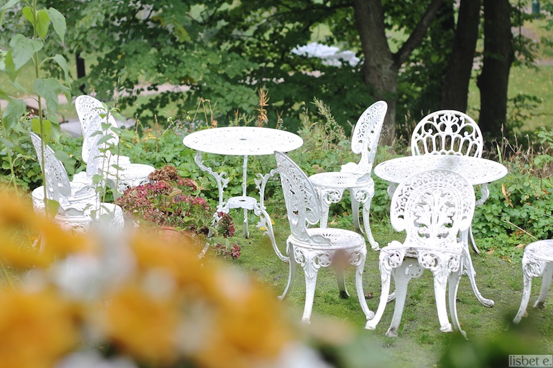 Tässä paikassa on jotain tyttökirjoista tuttua. Kartanon sivurakennus on vuorattu kukilla sekä sisä- että ulkopuolelta. Pääosassa ovat valtavat niput ruusuja, tuoreita, lakastuneita ja muovisia. Kahvilassa on yleensä vain muutama asiakas, paikkaa emännöivä vanha rouva istuu merenpuoleisella terassilla ja pelaa Angry Birdsiä. Vielä tänään lämpimassä sumusäässä tarkeni juoda teekupposet ulkosalla valkoisissa korituoleissa, joihin on valmiksi aseteltu huopia tulijoita varten.
