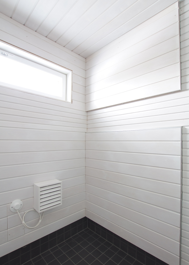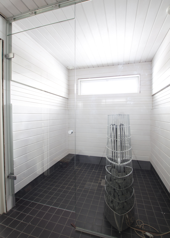 Saunassa oli itse asiassa mustat paneelit, kun ostimme talon. Niitä ei kuitenkaan oltu käsitelty ennen seinään kiinnittämistä, joten saunaa lämmitettäessä puu oli elänyt ja kutistunut ja saumoista oli tullut puunväriset, vaaleat raidat esiin. Koska lauteetkin olivat väliaikaiset, rakennusaikaisiksi tarkoitetut, päätimme purkaa koko saunan. Olen siis nähnyt tuon tilan sekä tummaksi että vaaleaksi paneloituna. Ei se tummakaan ollut yhtään hullumpi ja sitä kovasti harkittiin – ehkä kuitenkin enemmän sellaista tummanharmaata. Valkoinen kuitenkin lopulta voitti. Oikeastaan juuri tällä hetkellä ihailen perinteisiä puunvärisiä saunoja… la donna e mobile…