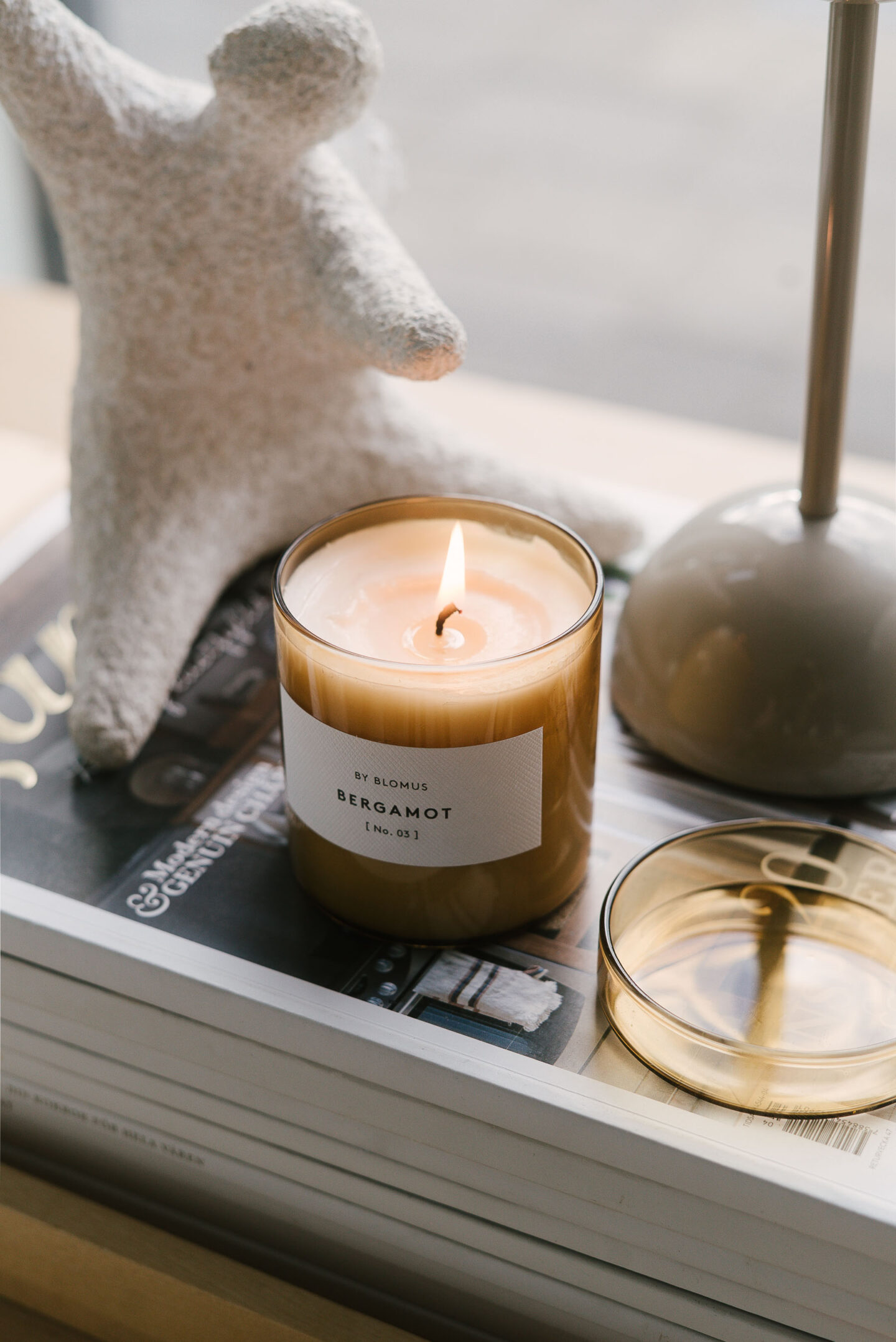 Ikkunan edessä tasolla on asetelma, jossa Päivi-anopin keraaminen veistos lämmittelee By Blomusin tuoksukynttilän (mainoslinkki Nordic Nest) äärellä. Kynttilän ulkoasu on selvästi inspiroitunut Byredon minimalistisista tuotteista, mutta hintalappu on vain murto-osan esikuvastaan. Soijavahakynttilässä on mieto bergamotin tuoksu, ja se sopii hyvin niille, jotka etsivät hentoa, lähes huomaamatonta huonetuoksua. &Traditionin ladattava pienvalaisin (mainoslinkki Nordic Nest) täydentää asetelman.