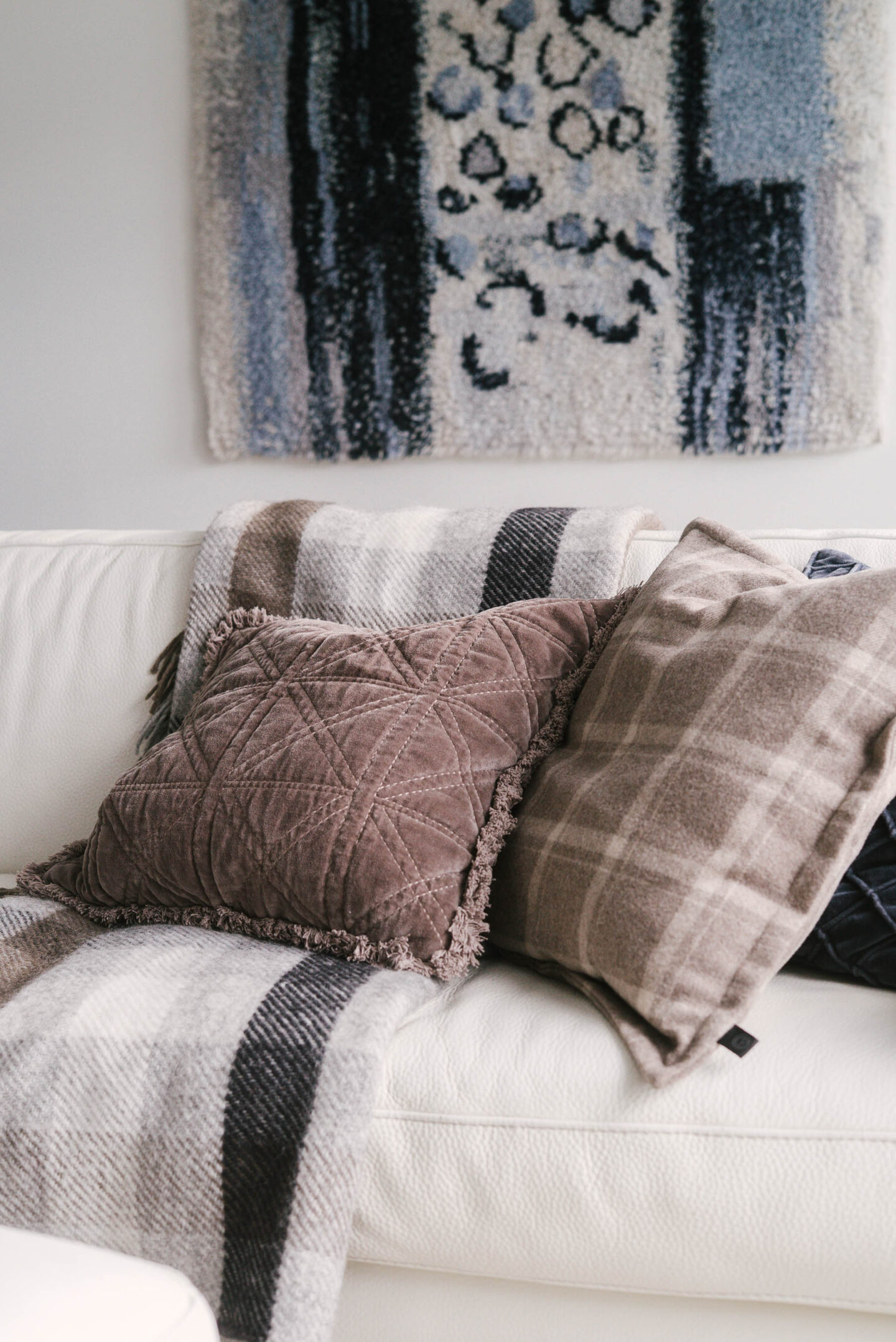 Olohuoneen puolella syysnäkymä muistuttaa pitkälti viimevuotista. Syksyistä tunnelmaa olohuoneeseen tuovat pehmeät tekstiilit ruskean, harmaan ja sinisen sävyissä. Tartan-kuvioinen koristetyynynpäällinen (mainoslinkki Hemtex) on tämänsyksyinen hankinta samoin kuin harmaanruskea lampaantalja (mainoslinkki Hemtex). Paimentolaistyylinen villamatto majailee olohuoneessa totta puhuen ympärivuotisesti, mutta tähän aikaan vuodesta se alkaa aina tuntua erityisen ihanalta.