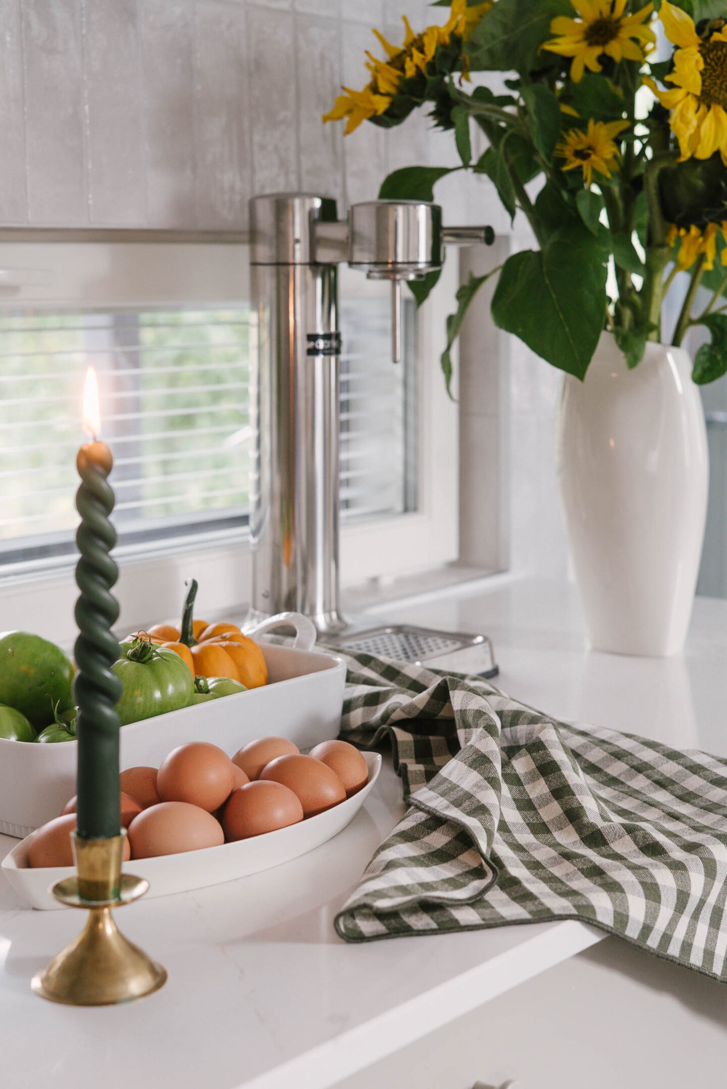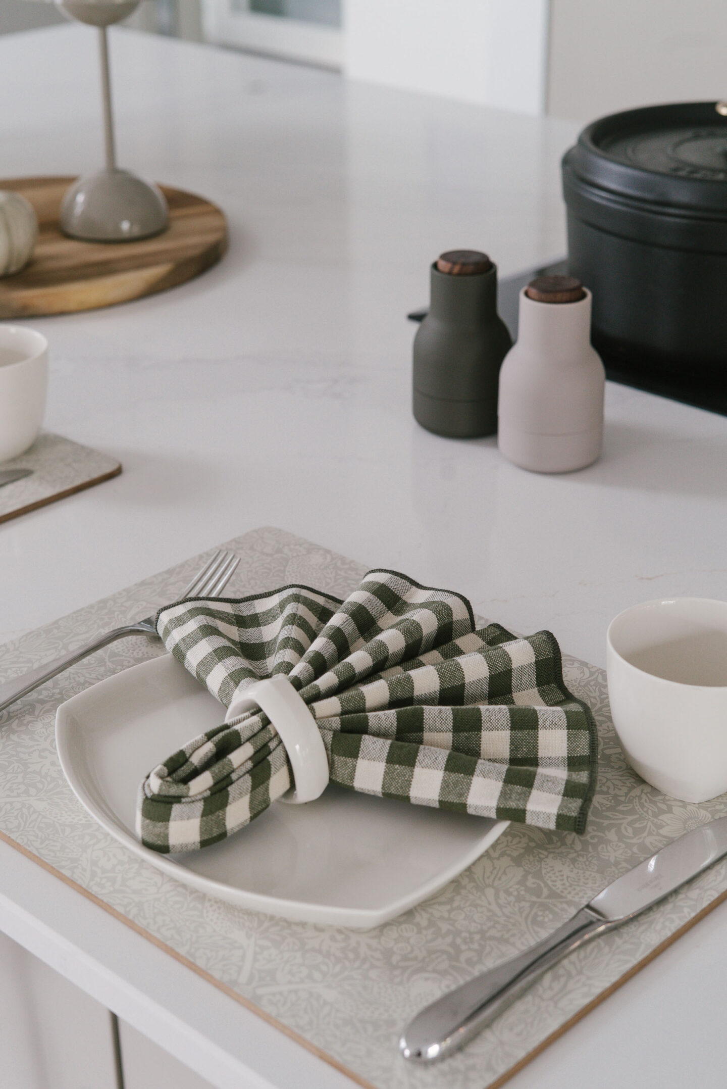 Saarekkeen uusista baarituoleista kirjoittelin jo alkuviikosta, jolloin kerroin, miten niistä oli tullut kodin uusi suosikkipaikka. Innostuin tekemään kattauksen kolmelle saarekkeen ääreen. Mummolatyyliin liittyen oletteko huomanneet, että klassista ruutukuviota on nyt kaikkialla? Keittiöön se saapui näissä Hemtexin metsänvihreissä lautasliinoissa ja keittiöpyyhkeessä (mainoslinkit Hemtex), joita on saatavissa myös burgundinpunaisina. Korkkipohjaisissa tableteissa on William Morrisin Strawberry Thief -painokuvio (mainoslinkki Nordic Nest). Myös Morrisin ikoniset kuosit tuntuvat tulevan nyt vastaan joka paikassa: tekstiileissä, tapeteissa, astioissa, vaatteissa…