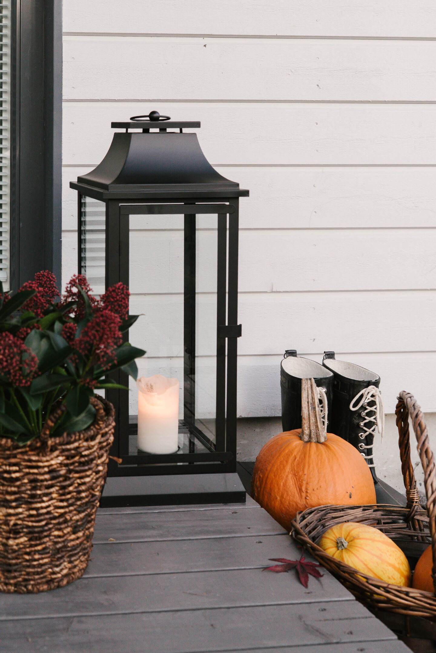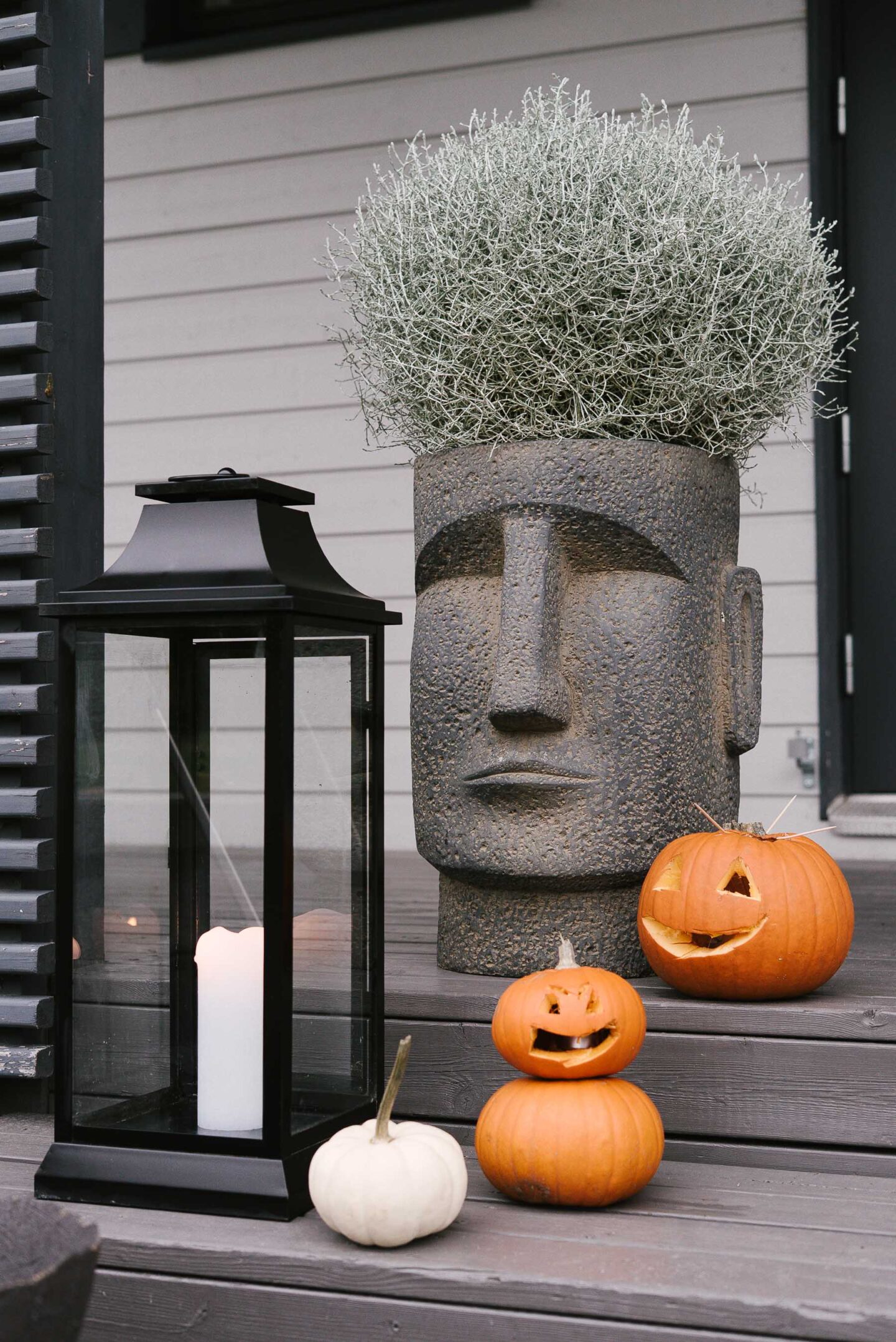 Sukelsin arkistoihin ja löysin muutaman kuvan menneiden vuosien asetelmista etuterassilla. Kurpitsat, lyhdyt ja yksinkertaiset syysistutukset tuntuvat olleen toimiva resepti. Useampana vuonna ruukussa on ollut suosikkiani, tummanpunaista skimmiaa ja sen seurana harmaata hopealankaa. Välillä olen istuttanut ruukkuun murattia reunan yli kiipeilemään.