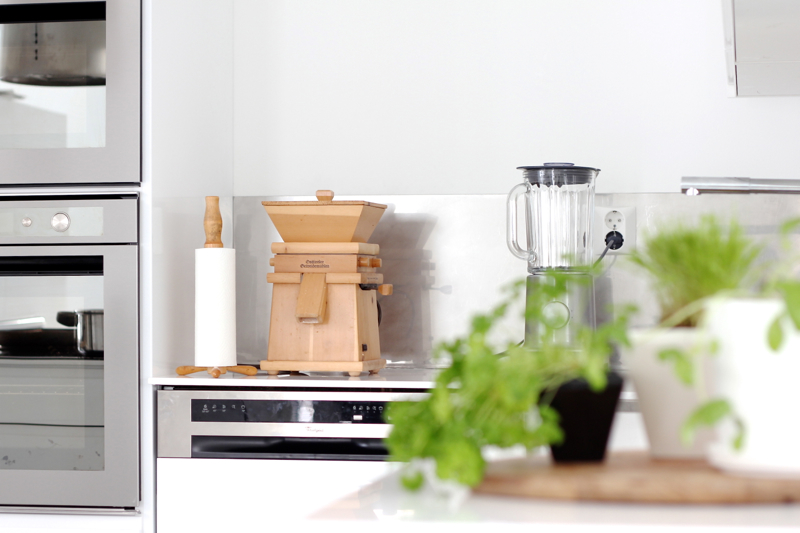 Teräslevy särkee keittiön kokovalkoista ilmettä, mitä joku voi pitää hyvänä, joku huonona asiana. Oma silmäni alkaa jo teräspintaan tottua ja löytyyhän sitä muualtakin keittiöstä, mm. kodinkoneista ja sokkeleista. Mietinnän alla ovat vielä nuo valkoiset pistorasiat. Ehdottomasti parhaat olisivat metallinväriset rasiat, mutta vain siinä tapauksessa, että ne oikeasti mätsäisivät taustaansa eivätkä näyttäisi yhtään muovisilta.