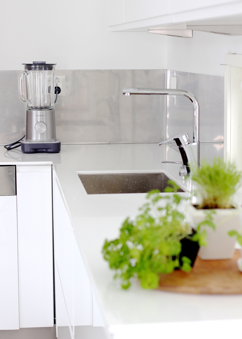Keittiön välitila sai hiljattain uuden ilmeen teräslevystä. Aiemmin kirjoittelin, että keittiön maalipintaisen seinän suojaksi suunniteltiin lasilevyä ensiasuntomme tapaan, mutta päätimmekin kokeilla jotain uutta ja tilaan asennettiin ruostumattomat teräslevyt. Teräs löytyi edullisesti romurautana, joten kynnys kokeiluun oli pieni. Alareunassa kulkee kapea teräksinen L-lista, yläreuna on listaton.