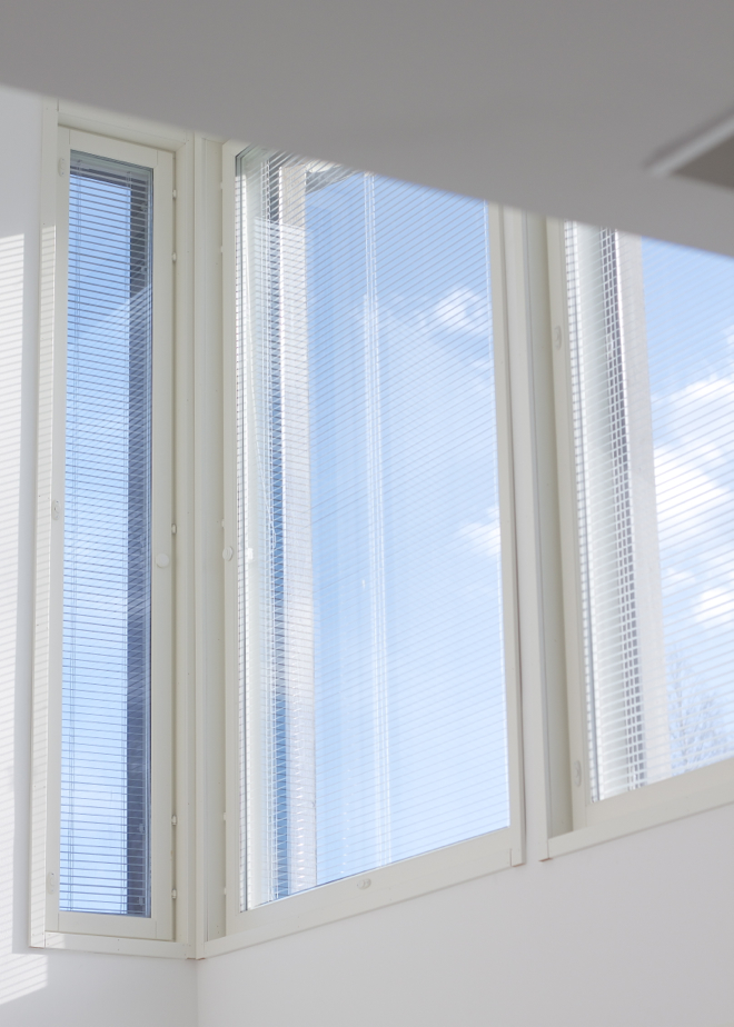 Sälekaihtimet tuovat ikkunaseinälle kivaa, viimeisteltyä ilmettä, vaikka syövätkin vähän tilan valoisuutta. Edelleen häiritsevät nuo kömpelöhköt ja kellertävät listat ikkunoiden ympärillä. Tarkoitus on vaihtaa ne jossain vaiheessa kapeampiin. Ihanne olisi tietenkin täydellinen listattomuus…