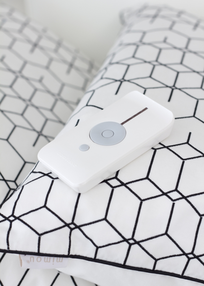 Moottoroituja rullaverhojakin mietittiin, mutta lopulta päädyimme asentamaan kaihtimiin Coulissen paristokäyttöiset kääntömoottorit, joita operoidaan alemman kuvan Apple-henkisesti muotoillulla kaukosäätimellä. Moottorit katoavat kätevästi verhokiskojen sisään.