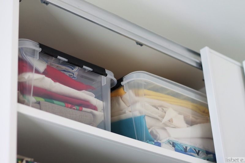 Ompeluharrastukseni peruja oleva kangasvarasto sai käydä läpi suurimmat leikkaukset. Kaikenlaista silppua ja lakanaa sitä onkin tullut jemmattua, toisaalta joukossa oli myös runsaasti hintavia virheostoksia, joiden materiaali ei ole sitten soveltunutkaan aiottuun vaatteeseen. En ole oikein ehtinyt paneutua koko käsityöharrastukseen pojan syntymän jälkeen, mutta toiveikkaasti uskon vielä jonain päivänä toteuttavani mielessä muhineet ideat. Siinäkin tapauksessa näissä ylähyllyn kolmessa muovilaatikossa sekä muutamassa rullalla säilytettävässä silkkikankaassa on minulle ompelemista enemmän kuin tarpeeksi.