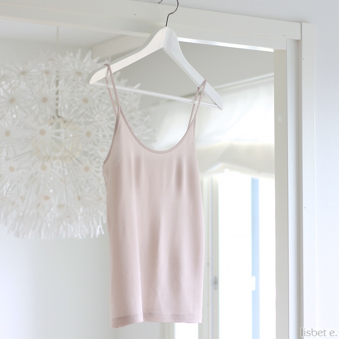Ostin tämän, koska muistin Karlan suositelleen vastaavanlaista mallia. Huomaamaton ihonvärinen toppi on aivan ehdoton läpikuultavien yläosien alla. Olen käyttänyt tarkoitukseen mm. Zaran perusmallin narutoppeja, mutta niiden materiaali (ehta polyamidi) sähköistyy helposti ohuen puseron kanssa käytettynä. Pahimmillaan staattinen sähkö saa laskeutuvan puseron liimautumaan kiinni alustoppiin. Tämän Filippa K:n topin materiaali on viskoosia ja lycraa ja selvisi ongelmitta tämänpäiväisestä testistä läpikuultavan polyesterisifonkitopin parina.